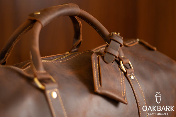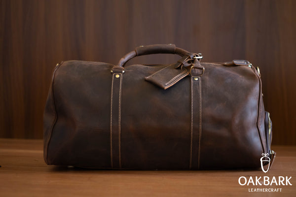 Like all OakBark Leathercraft products, this duffle bag is made from natural leather.